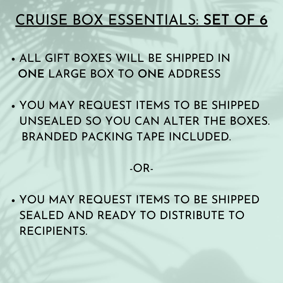 Surprise your traveler with a curated box of all their cruise essentials! Items may vary in color, but all boxes include: